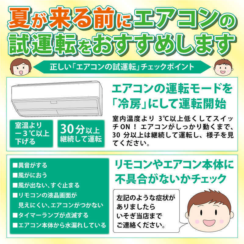 暑い夏を迎える前に、お早目に「エアコンの試運転」をお願いします!エアコンを使い始める本格的な夏になると、点検や修理が集中しお待たせしてしまうことになります。試運転やエアコンのことで何かございましたら、お気軽に当店までご連絡ください♪